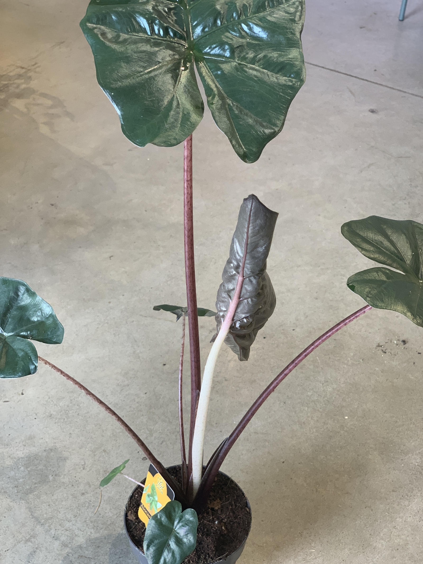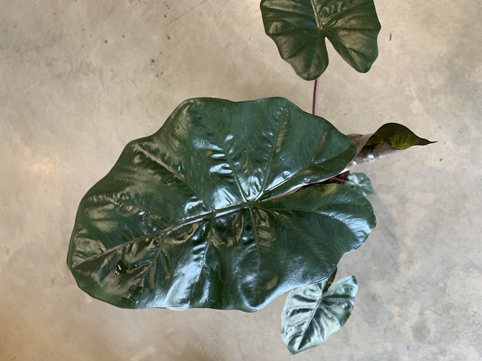 Uhke purpurjas-lillakate varte ja läikivate lehtedega alokaasia.