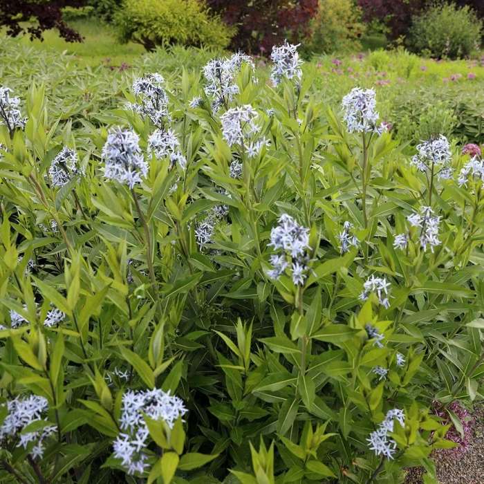 Pikaealine, püstise kujuga puhmaid moodustav püsik, mis on pärit Põhja-Ameerikast. Taime kitsad ja kuni 8cm pikad erkrohelised lehed meenutavad paju lehti. Mai lõpus, juuni alguses alustab pajulehine amsoonia oma pikka õitsemisaega, mis kestab 4-6 nädalat ning avab oma väikesed, kahvatusinised, valge südamikuga tähekujulised õied, mis on koondunud hõredatesse õisikutesse.