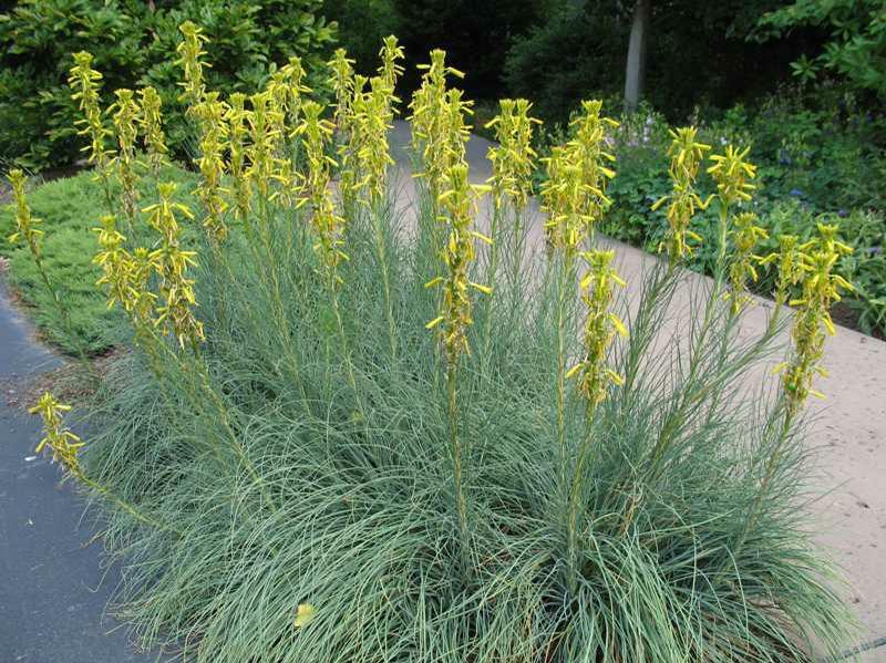 Vahemeremaadest pärit, võõrsil ka surnute lilleks või kuninga odaks nimetatud parukliilia on nii lehestiku kui ka õite poolest dekoratiivne valik. Peente, kitsaste, niitjate lehtedega sinakasrohelistest leheklumpidest tõusevad püstised, kohati pooleteise meetri kõrguseni ulatuvad õievarred kollast värvi tõrvikulaadsete õisikutega. Õied asetuvad varte tippudel tihedalt, on lõhnavad ja keskmiselt 3 cm läbimõõduga. Neist moodustuvad hiljem pruuni värvi seemnekobarad, mida võib säilitada sügisese dekoratiivsuse eesmärgil. Armastavad sooja ja päikeselist kasvukohta. Ei talu rasket ning liigselt niiskust kinni pidavat mulda. Hea taim massistutusteks ja gruppidesse. Sobib hästi looduslikku aeda.