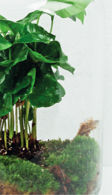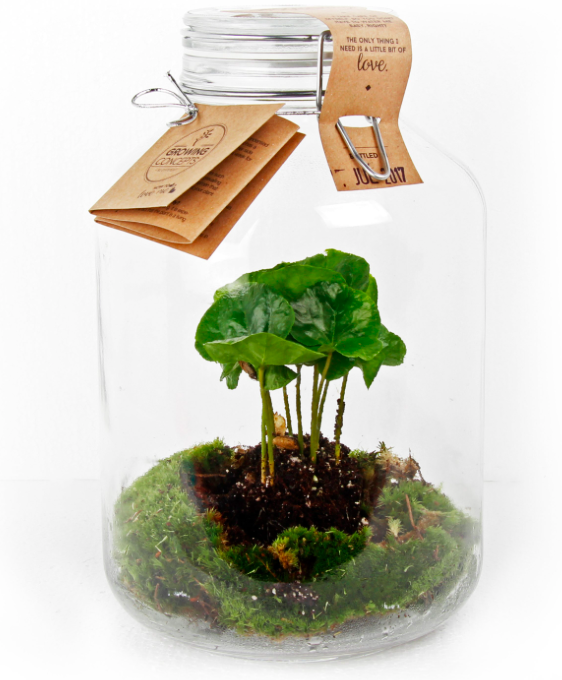 Coffea arabica on kõikidele tuttav nimi, ehkki igapäevaselt on selle taime viljad meid hommikuti äratamas kohvitassis. Klaaspurgis kohvitaim on istutatud spetsiaalsesse segusse, et ta ei kasvaks väga suureks. Purgis tekib taime kasvades omaette ökosüsteem, mis toidab iseennast. Kuna purk on hermeetiliselt suletud, siis kasutab väike taim toitaineid ja niiskust uuesti ja uuesti. Taime ei pea kastma, seega on see väike imeline kohvitaim äärmiselt sobilik neile, kes unustavad pidevalt taimi kasta. Asetada valgesse kohta, aga mitte otsese päikesevalguse kätte, kuna purgis tõusev temperatuur võib taime kahjustada. Kui kondensvett koguneb purgi seintele liiga palju, võib purgi ka tunniks ajaks avada ja õhutada.