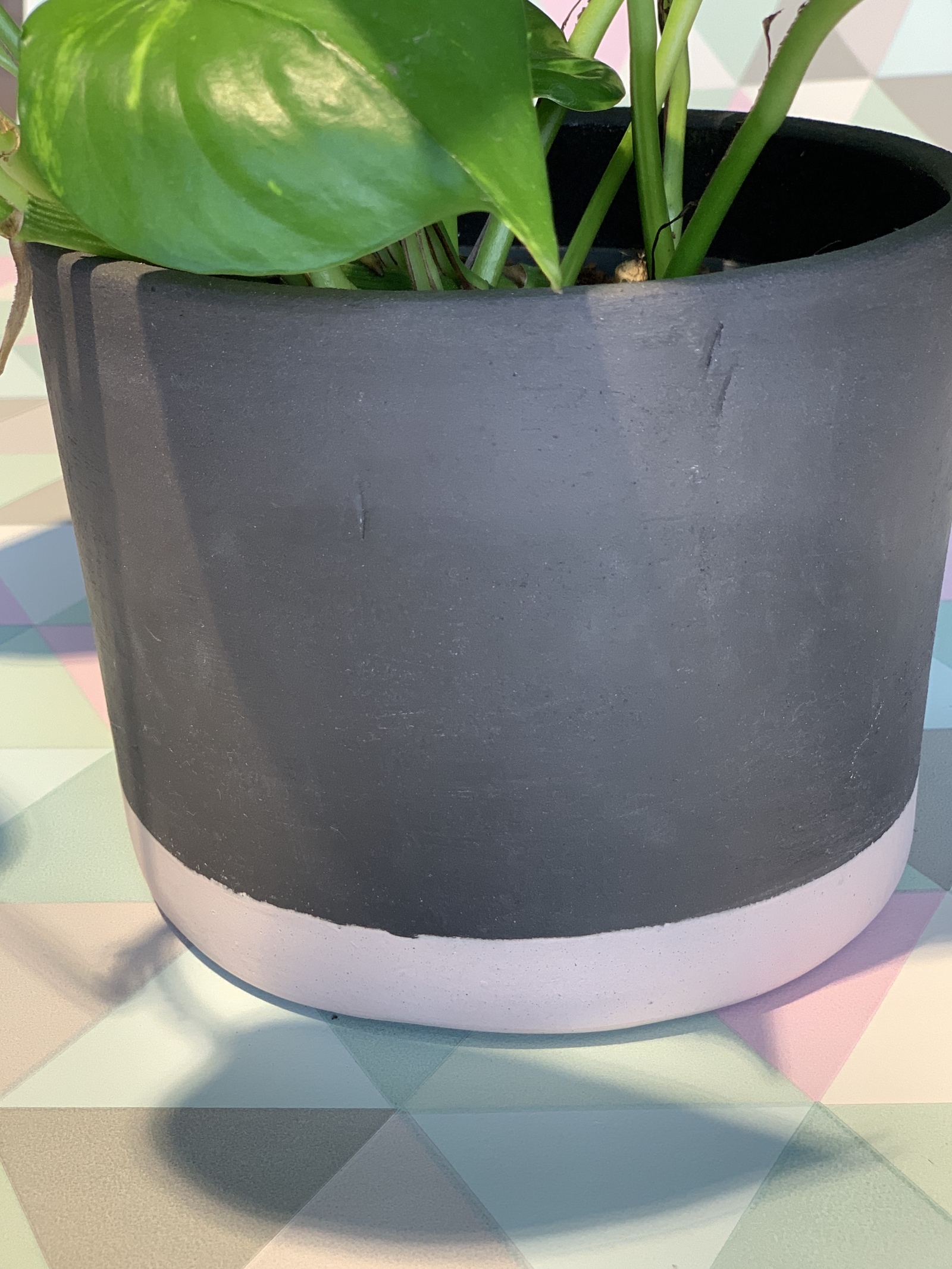Potid on rustikaalsest mustast savist, all servas eri värvi triibud.