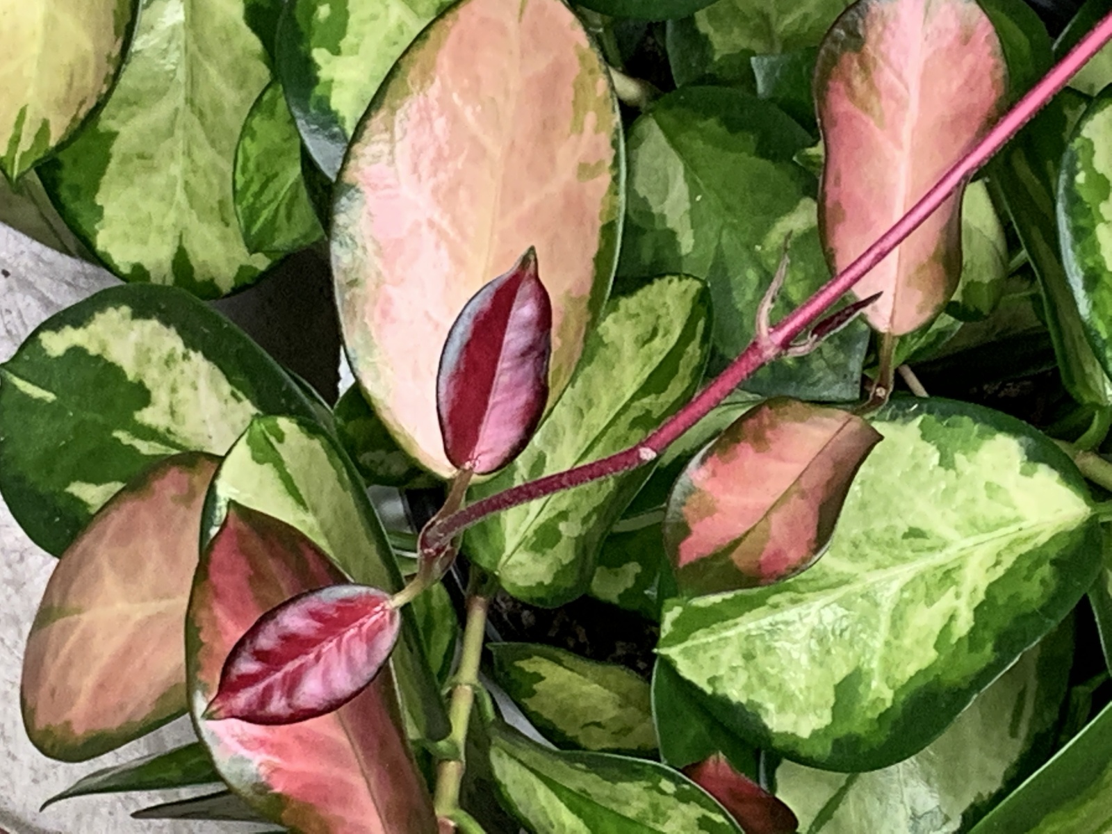 Imekena vahalill, mille lehed on õrnroosa siseosa ja rohelise servaga.