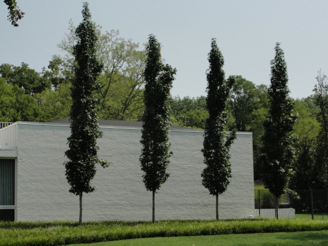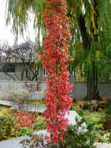 Puu armastatuimaks eripäraks on tema kaunis sihvakas vorm. Kõrge ning kitsa võraga puu on ideaalne kitsastesse kohtadesse, väiksemasse aeda või silmatorkava vertikaalse aktsendi loomiseks. Kevadel õitsevad valged õied, sügisel valmivad neist seemneid tulvil ogalised viljapallid. Kohati on viljad inimeste jaoks häirivaks osutunud, kuid tegelikkuses on puu nii kitsas, et need vähesed viljad, mis valmivad, kukuvad küllaltki väga väikese territooriumi peale. Seega tegelikkuses ei tohiks mahakukkunud viljad kedagi oluliselt häirida. Kiire kasvuga puu tähekujuline lehestik on suvel tumeroheline, sügisel ulatub aga värv kollasest kuni tumepunaseni. Kui lehestik maha varisenud, paljastub puu kortsuline koor, mis toob põnevust ka talvisesse perioodi.