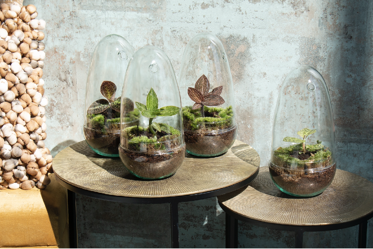 Imeline Malai briljantkäpp kenas klaasist terraariumis, mis hoiab taime ümber paremat õhuniiskust.