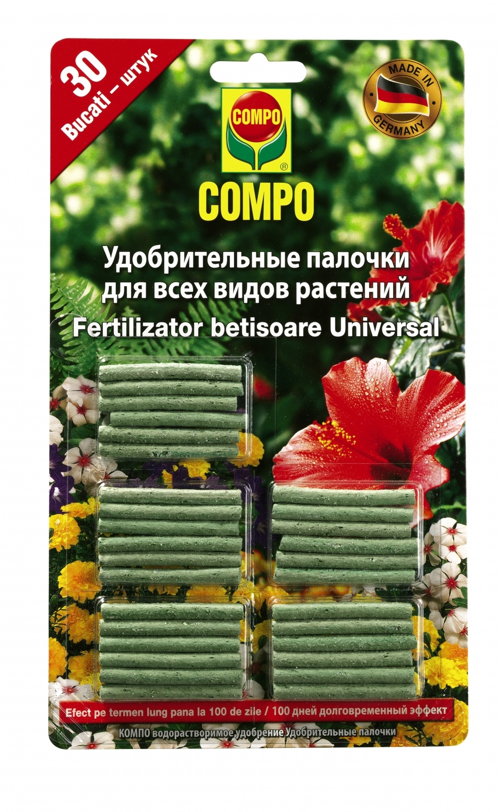 Väetisepulgad rohelistele taimedele Compo sisaldavad kõiki vajalikke põhi- ja mikrotoitaineid. Pikaajaline lämmastik vabaneb vastavalt taime vajadusele 3 kuu jooksul. Guaano (linnusõnniku) mahedad toitained hoolitsevad terve kasvu ja sügavroheliste lehtede eest. Väetisepulkadega vältitakse nii üle- kui alaväetamist. Kõik olulisemad põhi- ja mikrotoitained sisalduvad igas pulgas. EÜ väetis