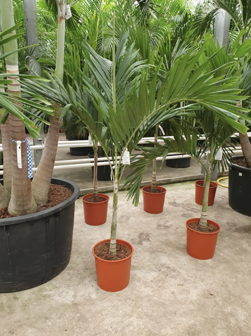 Kasta regulaarselt, aga kindlasti ära lase potil vees seista. Väetamist palmid eriti taha, seda võib teha korra või paar suve jooksul. Samuti ei taha nad sagedast ümberistutamist. Kui juurepall on potist väga palju välja kasvanud, alles siis võib ümber istutada suuremasse potti.